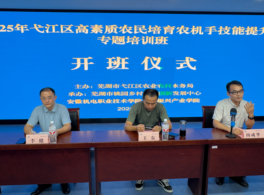 开班仪式由芜湖市桃园乡村振兴创新发展中心主任、安机电乡村振兴产业学院执行院长杨咸华博士主持,安机电乡村振兴产业学院常务副院长李健致欢迎辞,表达了对各位农机手学员的热烈欢迎,并希望全体学员珍惜学习机会,掌握新知识新技能,成为引领一方、带动一片的乡村发展骨干力量。随后,芜湖市弋江区农业服务中心副主任王东做开班动员讲话,他阐述了举办此次培训班的重要意义,指出培养造就一支懂农业、懂技术、善经营的高素质农民队伍,是适应现代农业发展新要求、加快推进农业农村现代化的重要举措。特别是提升农机手的专业操作技能与综合素养,对于保障粮食安全生产、提高农业综合效益、促进乡村产业振兴具有关键作用。