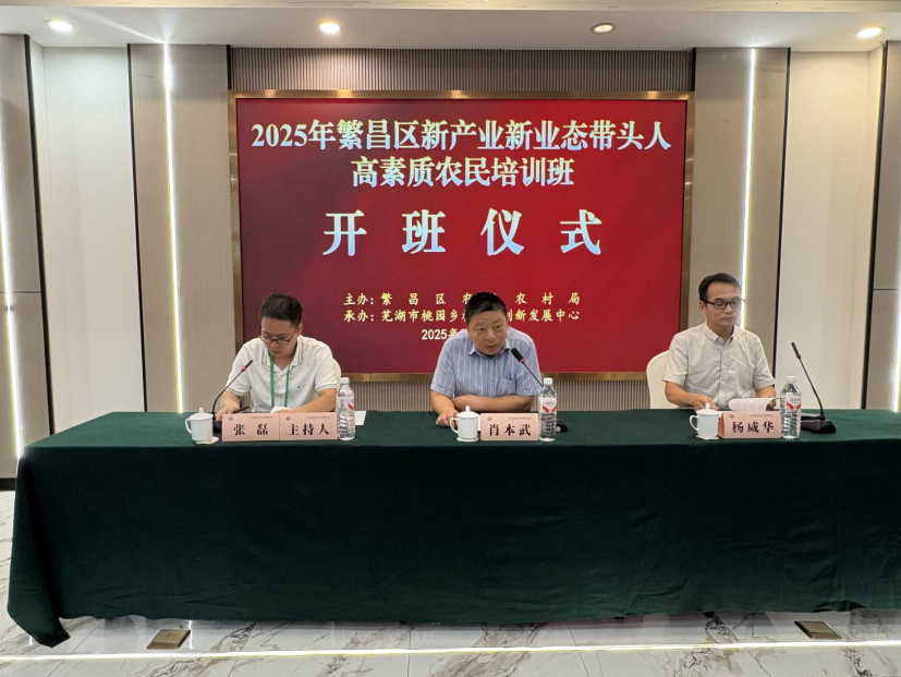 为加快培育乡村新产业新业态带头人,赋能乡村振兴战略实施,8月27日上午,由芜湖市繁昌区农业农村局主办、芜湖市桃园乡村振兴创新发展中心承办的2025年繁昌区新产业新业态带头人高素质农民培训繁昌区繁阳镇开班。本次培训旨在培育一批适应乡村新产业新业态发展需求的高素质农民带头人,为繁昌区乡村振兴注入新动能,为区域农业农村现代化提供人才支撑。