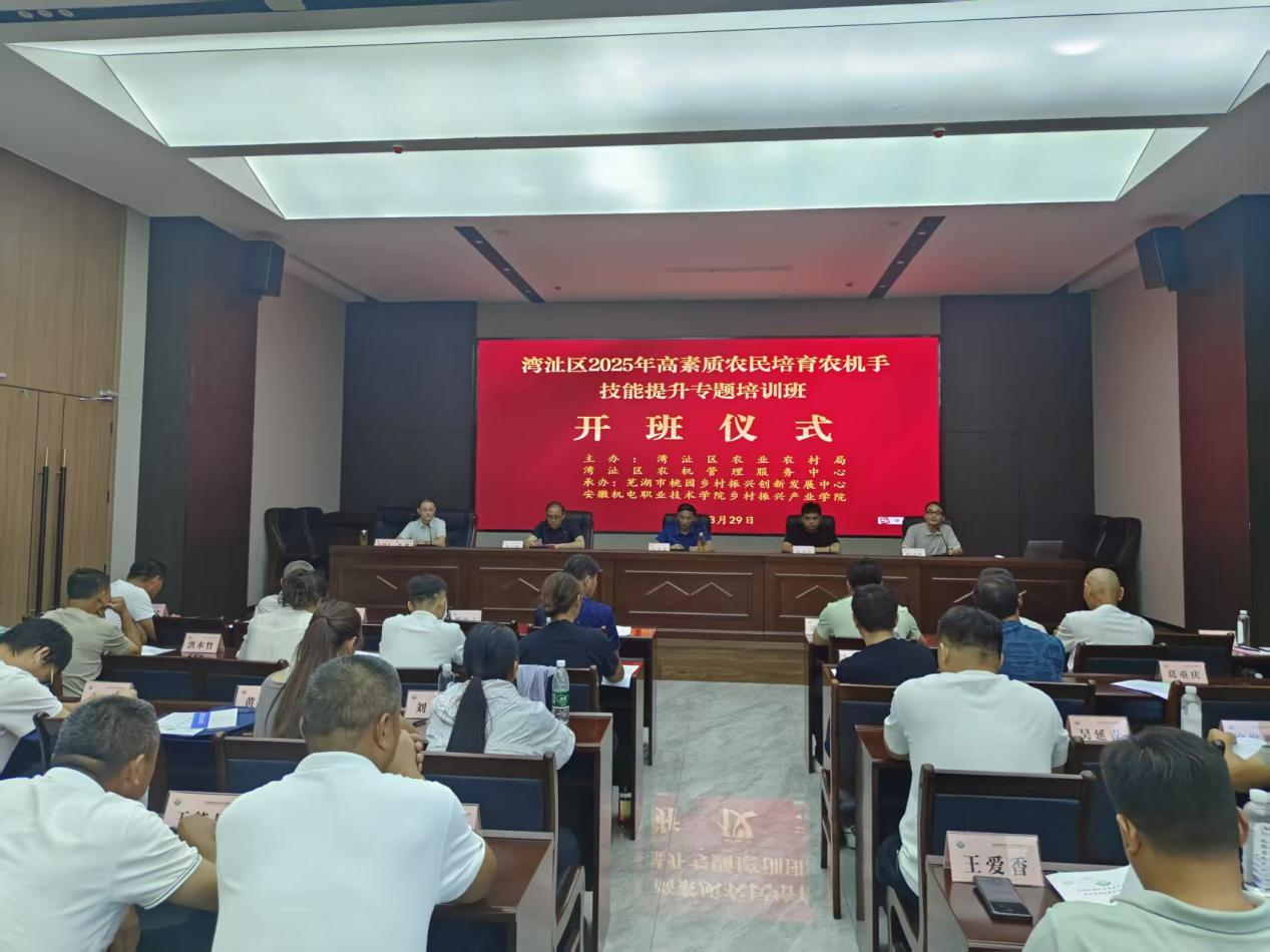 8月29日,湾沚区2025年高素质农民培育农机手技能提升专题培训班在湾沚镇桃园乡村振兴学院正式开班。 本次培训由芜湖市桃园乡村振兴创新发展中心、安徽机电职业技术学院共同主办,芜湖市湾沚区农业农村局提供业务指导,旨在通过系统化、专业化培训,提升全区农机手操作技能与综合素养,为乡村振兴注入人才动力。
