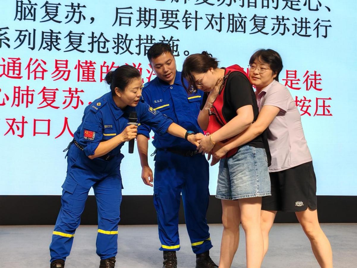 小学专场分两批进行,1007名教职工聚焦于“小学生行为安全管理”和“网络安全”“反电诈”等课程学习。区消防局、公安局及蓝天救援队分别开展消防安全和防溺水应急救护实操教学。